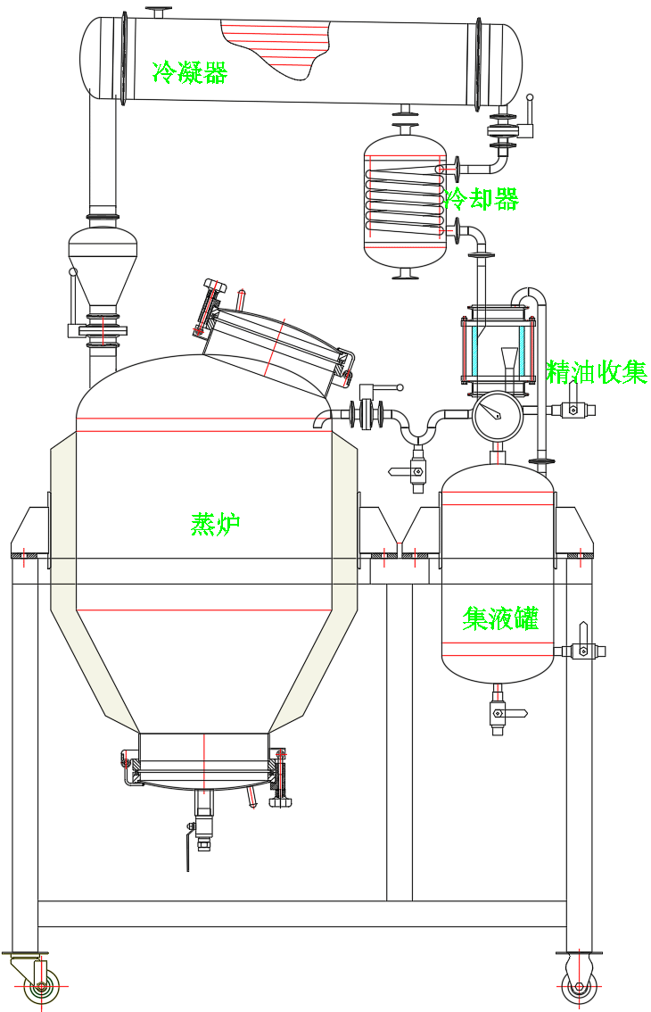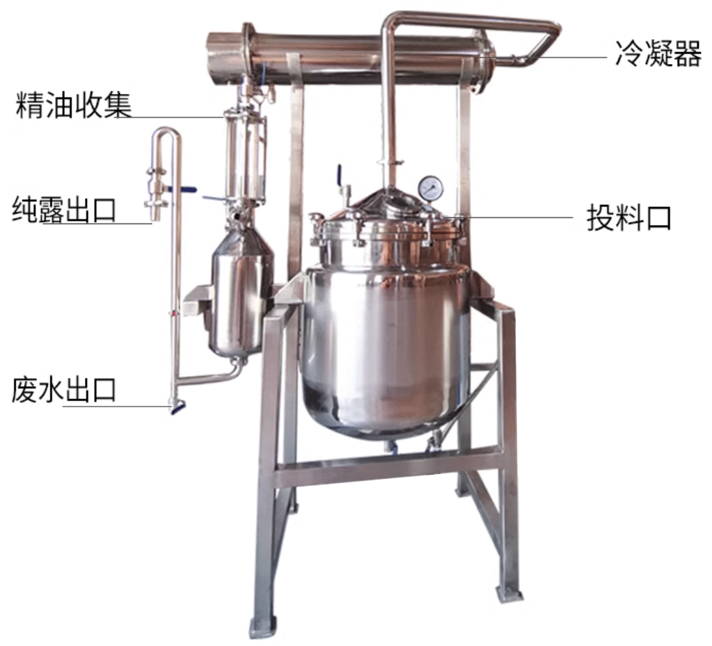 工藝流程:開(kāi)啟加水,可隔水蒸餾,也可共水蒸餾,開(kāi)電加熱或蒸汽,水沸騰產(chǎn)生蒸汽,蒸汽透過(guò)提取機(jī)內(nèi)物料,隨及將精油純露析出,精油純露蒸汽沿排汽管上