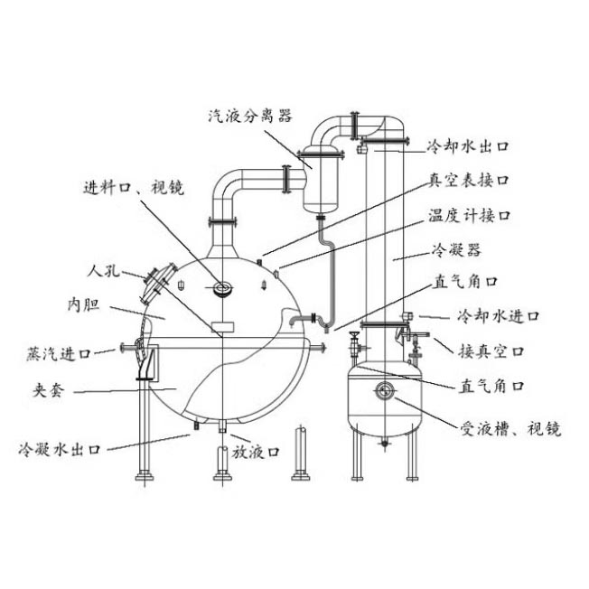 球形濃縮罐主要由濃縮罐主體、冷凝器、氣液分離器、受液桶四個部分組成,可用于制藥、食品、化工等行業(yè)對料液的濃縮、蒸溜及有機溶